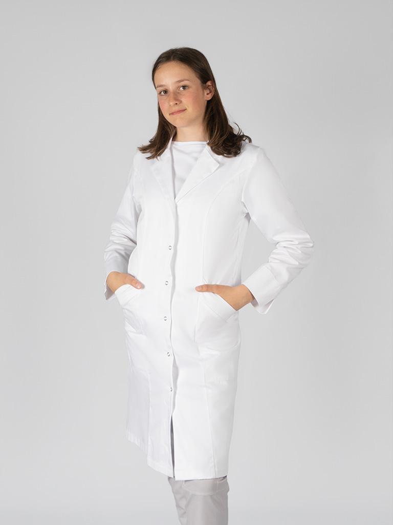 Ženska halja, ki navdušuje s svojim klasičnim videzom in teliranim krojem. Zapenjanje je na pritiskače. Halja ima klasičen ovratnik, dolge rokave ter dva našita žepa spredaj.